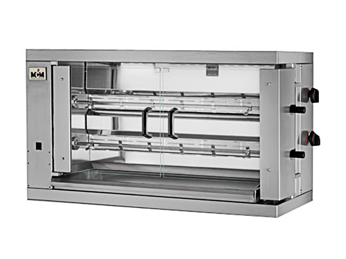 Asador de pollos a gas 2 espadas 2EG de MCM, con mismo equipo gas y transmisión que los clásicos verticales.