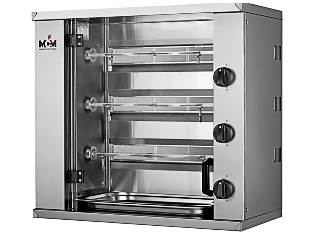 Asadores de pollos mini a gas MN4G de MCM, ideal para locales con espacio reducido, con capacidad de 3 pollos por espada.