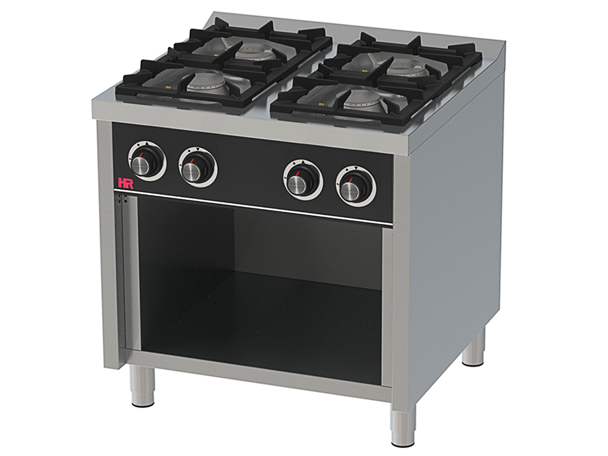 Cocina a Gas C4F750E de HR Fainca con fuegos superiores de gran rendimiento calorífico. Cuerpo en acero inoxidable AISI 304. Parrilla superior fundición. Todos los quemadores incorporan llama piloto. Termopar de seguridad. Incluyen sistema de elevación de la encimera para su mantenimiento o reparación.Altura mínima de chimenea para la utilización de cazuelas de gran diámetro. Burlete en fibra de vidrio, alta resistencia. Patas de acero inoxidable regulables en altura. Horno gastronorm 2/1. Encimera embutida de acero Inoxidable AISI 304 espesor 1,5 mm.