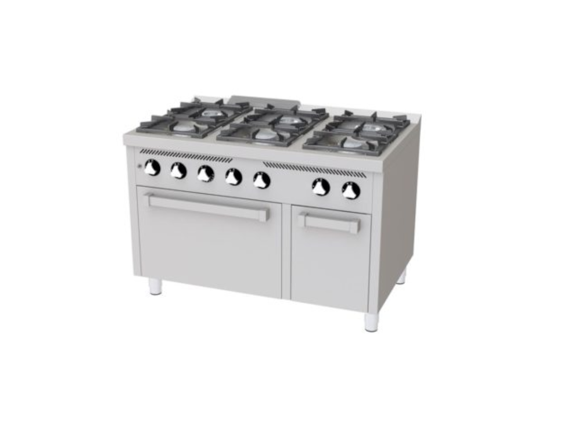 Cocina a Gas C6F900H de HR Fainca con fuegos superiores niquelados para gran rendimiento calorífico. Cuerpo en acero inoxidable AISI 304. Parrilla superior fundición. Parrilla horno anti-vuelco extraíble. Válvula termostática de serie en el horno. Horno con encendido automático.