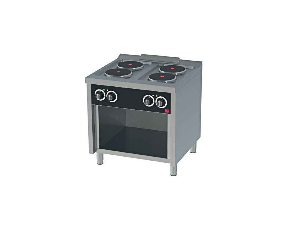 Cocina Eléctrica CE4P750E de HR Fainca para la preparación rápida de alimentos. Cuerpo en acero inoxidable AISI 304. Placa eléctrica de alto rendimiento con limitador de temperatura y reparto calor uniforme. Patas de acero inoxidable regulables en altura.