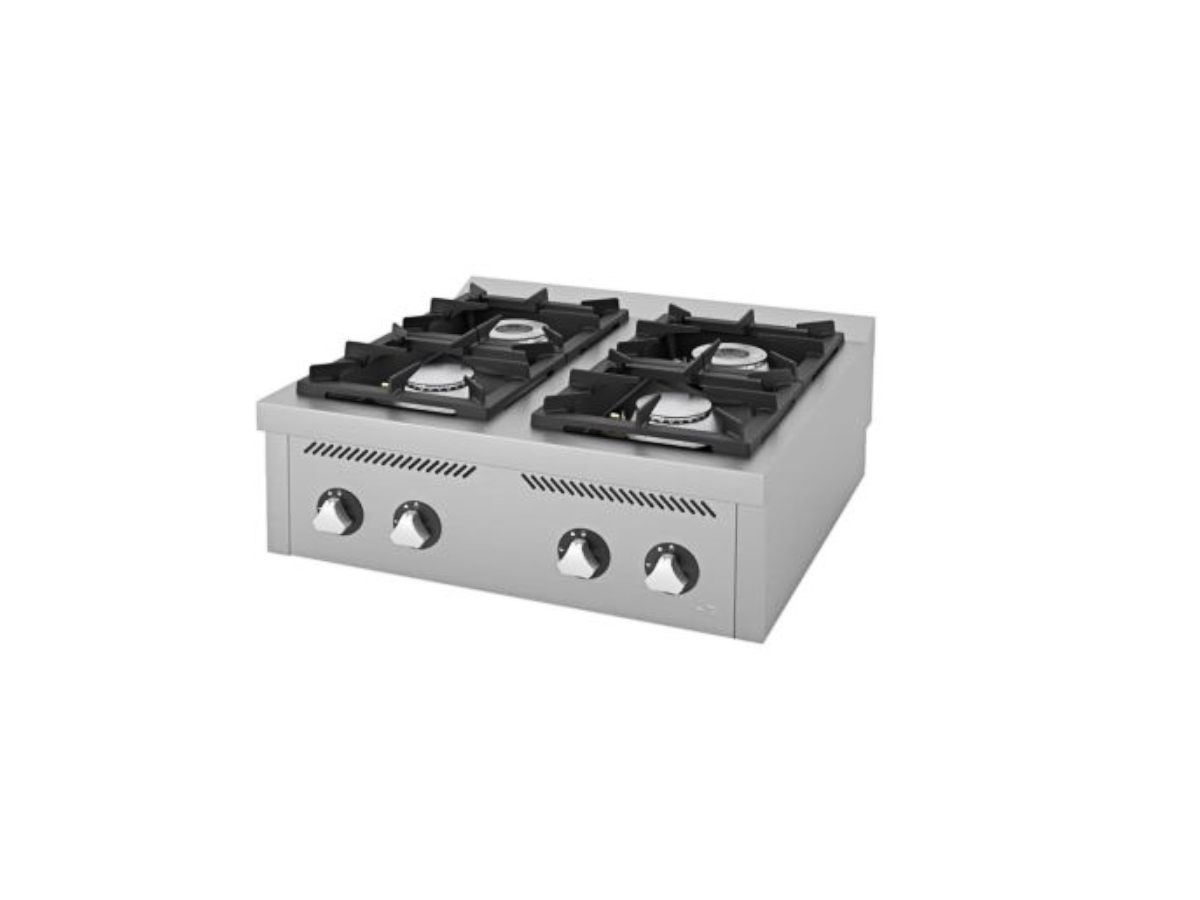 Cocina a Gas C4F750S de HR Fainca con fuegos superiores niquelados con gran rendimiento calorífico. Cuerpo en acero inoxidable AISI 304. Parrilla superior fundición. Todos los quemadores incorporan llama piloto. Termopar de seguridad. Incluyen sistema de elevación de la encimera para su mantenimiento o reparación.Altura mínima de chimenea para la utilización de cazuelas de gran diámetro. Burlete en fibra de vidrio, alta resistencia. Patas de acero inoxidable regulables en altura. Horno gastronorm 2/1. Encimera embutida de acero Inoxidable AISI 304 espesor 1,5 mm.