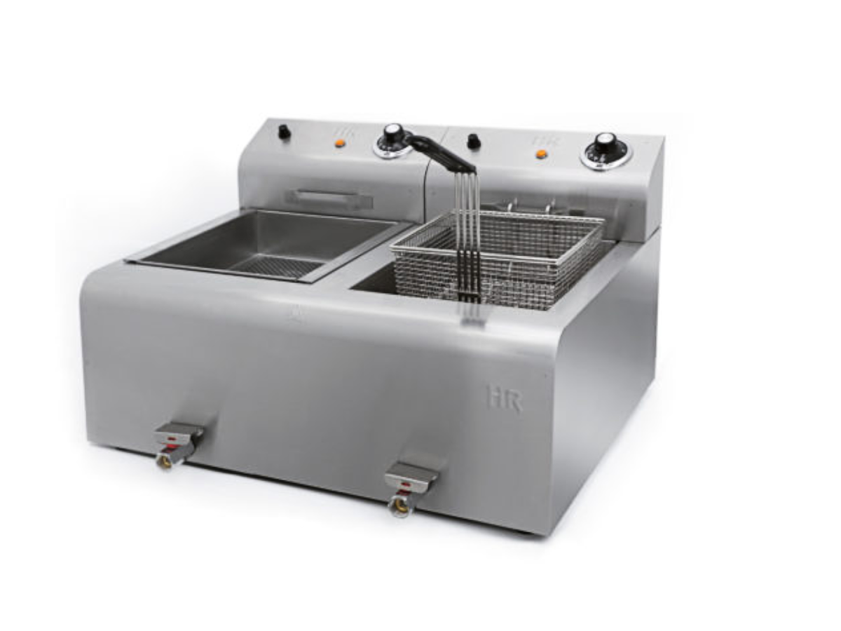 Freidora 10+10 Litros FD10L10L600 de HR Fainca termostato de trabajo regulable hasta 195º C de 20A. Termostato de seguridad rearmable 230º C de 20A. Cuba embutida de acero Inoxidable AISI 304 con amplia zona fría. Indicador MAX-MIN de nivel de aceite. Resistencia en acero Inoxidable pulido. Piloto metálico LED ámbar,indicador de funcionamiento de la resistencia. Todas las freidoras tienen contactor de 20A y los modelos AR y TRIF contactor de 40A. Las dimensiones no tienen en cuenta el saliente del mango de la cesta. Las cestas son de máxima calidad.