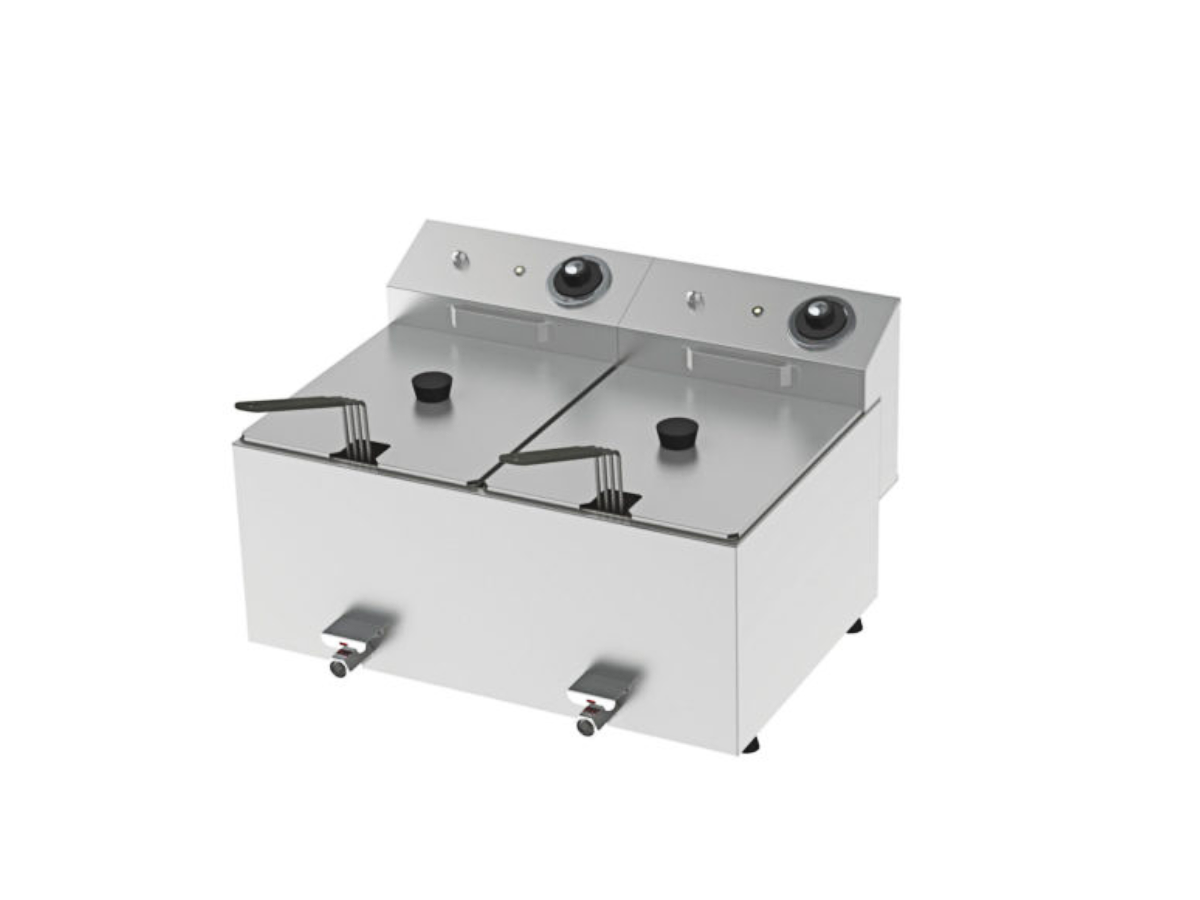 Freidora 10+10 Litros FD10L10LARC de HR Fainca termostato de trabajo regulable hasta 195º C de 20A. Termostato de seguridad rearmable 230º C de 20A. Cuba embutida de acero Inoxidable AISI 304 con amplia zona fría. Indicador MAX-MIN de nivel de aceite. Resistencia en acero Inoxidable pulido. Piloto metálico LED ámbar,indicador de funcionamiento de la resistencia. Todas las freidoras tienen contactor de 20A y los modelos AR y TRIF contactor de 40A. Las dimensiones no tienen en cuenta el saliente del mango de la cesta. Las cestas son de máxima calidad.
