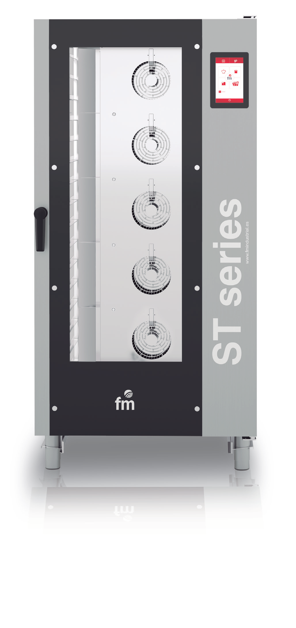 Horno profesional FM Industrial, de la serie ST , modelo ST 616 V7, con capacidad para 16 GN 1/1 o EN 60 x 40. Pantalla 7″ táctil. Programable hasta 99 programas con 6 fases cada uno. Lavado automático de serie. Cool Down y Preheat. Sonda al corazón opcional. Cocción Delta T incluidos. Puerto USB. Inversión de giro y 10 velocidades del ventilador. Vapor de 0% a 100% regulable.