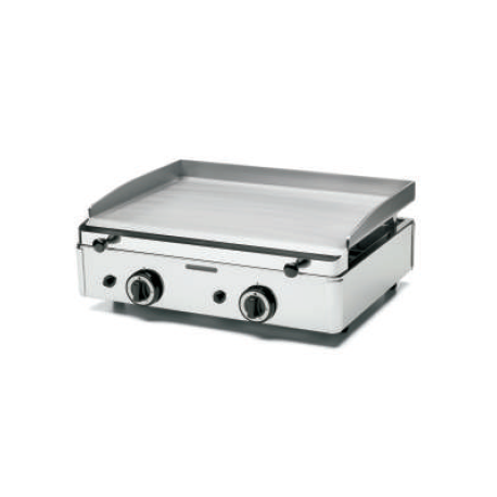 Plancha a gas con estructura en acero inoxidable.