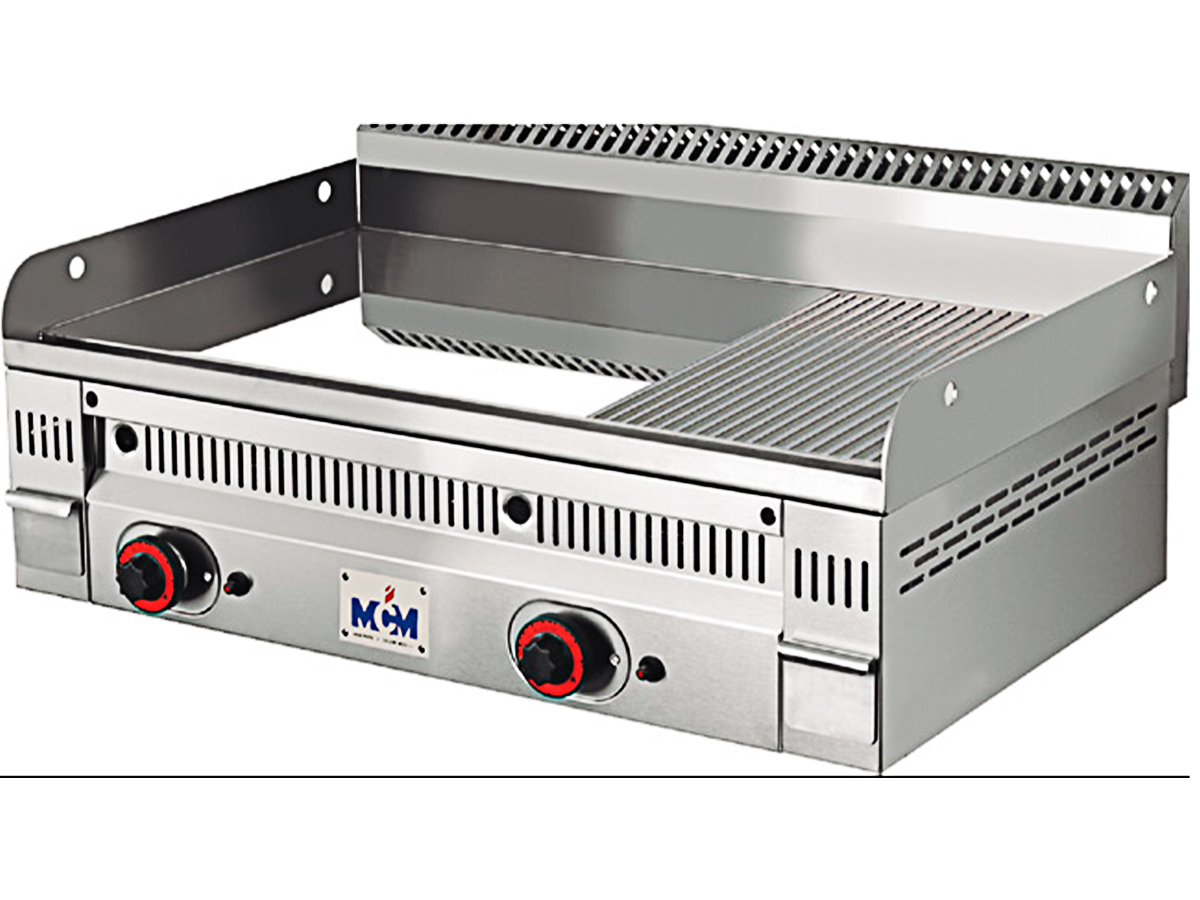 Plancha rectificada termostática semi ranurada fondo 55 a gas PLR-120 de MCM, con placa de acero rectificado de 20 mm.