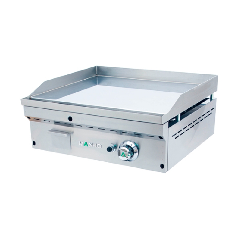 Fry top a Gas liso FCE-60 Mainho Profesional. Placa de CROMO DURO de 20 mm de espesor. Cajones recolectores de grasas en ambos laterales . Encendido por tren de chispas a batería – válvulas de gas con dos intensidades de calor y llama piloto.Resistencias blindadas de acero inoxidable.
