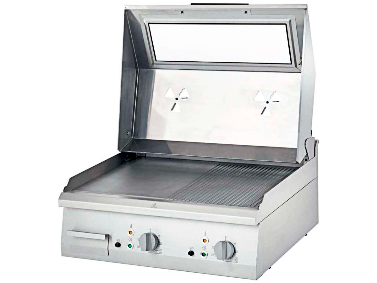 Frytop eléctrico con tapa fondo 700 9731390 de CLIMA HOSTELERÍA, con tapa de acero inoxidable de serie, que permite reducir el consumo de energía hasta en un 30% y mejora el efecto culinario de los productos a la parrilla.