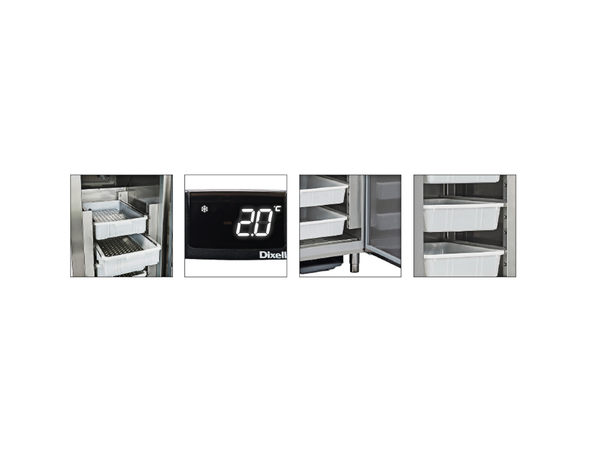 Puerta reversible para una mayor versatilidad a la hora de colocarlo en el local del cliente Incluye 7 cubetas plásticas en dotación.