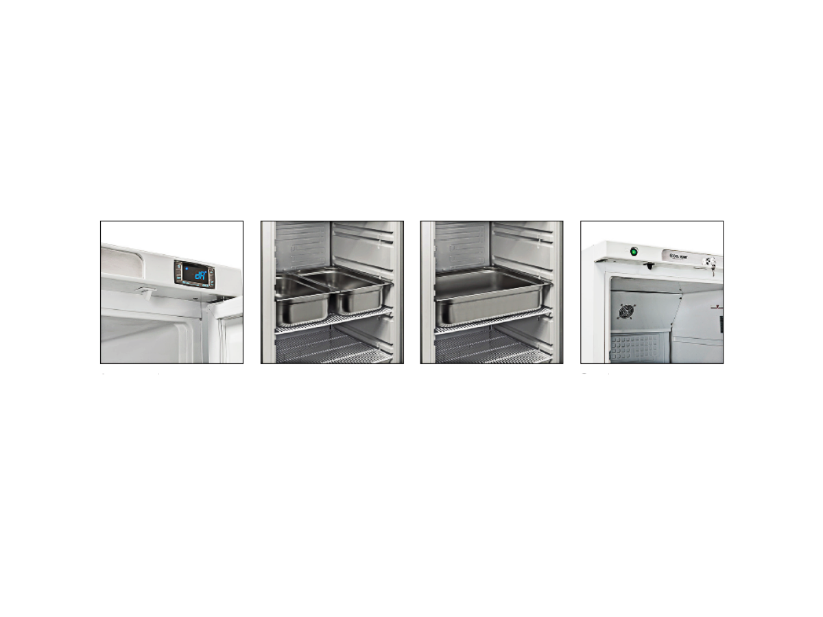 Cuatro estantes ajustables ajustables y un fijo GN 2/1 y cerradura en dotación.