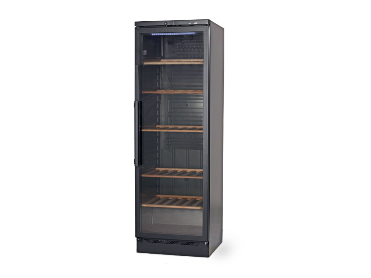 Armario expositor de vinos VKG 571 de EUROFRED con estantes de madera regulables en altura.