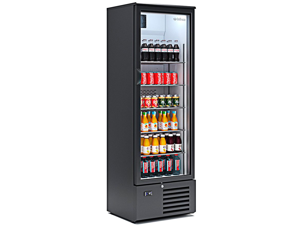Armario expositor refrigerado ERV 53 de INFRICO, con exterior en acero plastificado negro e interior en acero plastificado gris.
