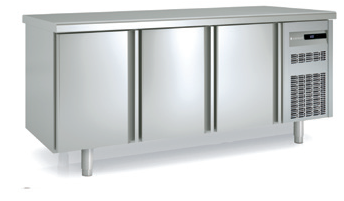 – Encimera de acero inox AISI-304 18/10 con frente curvo y peto trasero sanitario de 100 mm (opcional sin peto)