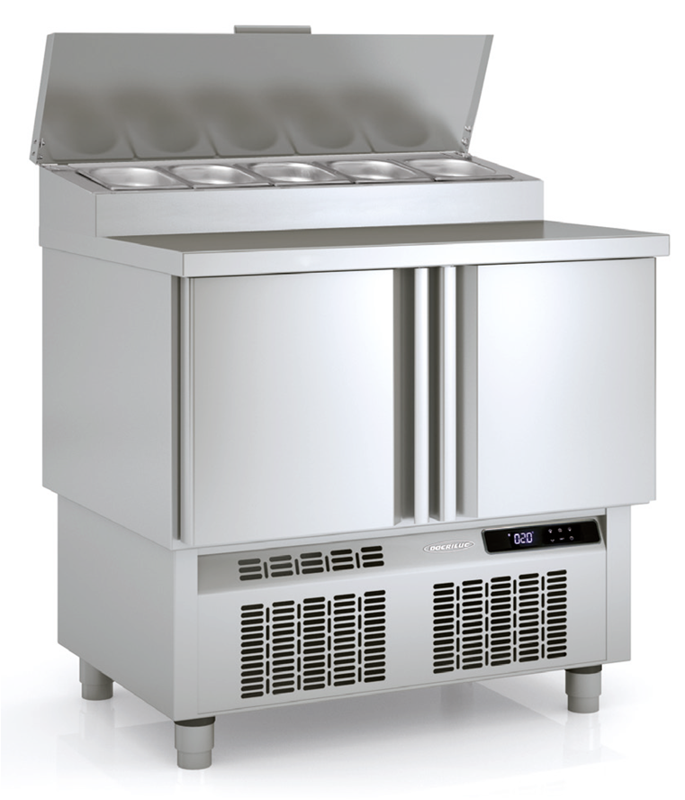 – MEI70 encimera inox, cubierta inox abatible sobre expositor ingredientes GN 1/4-150.
