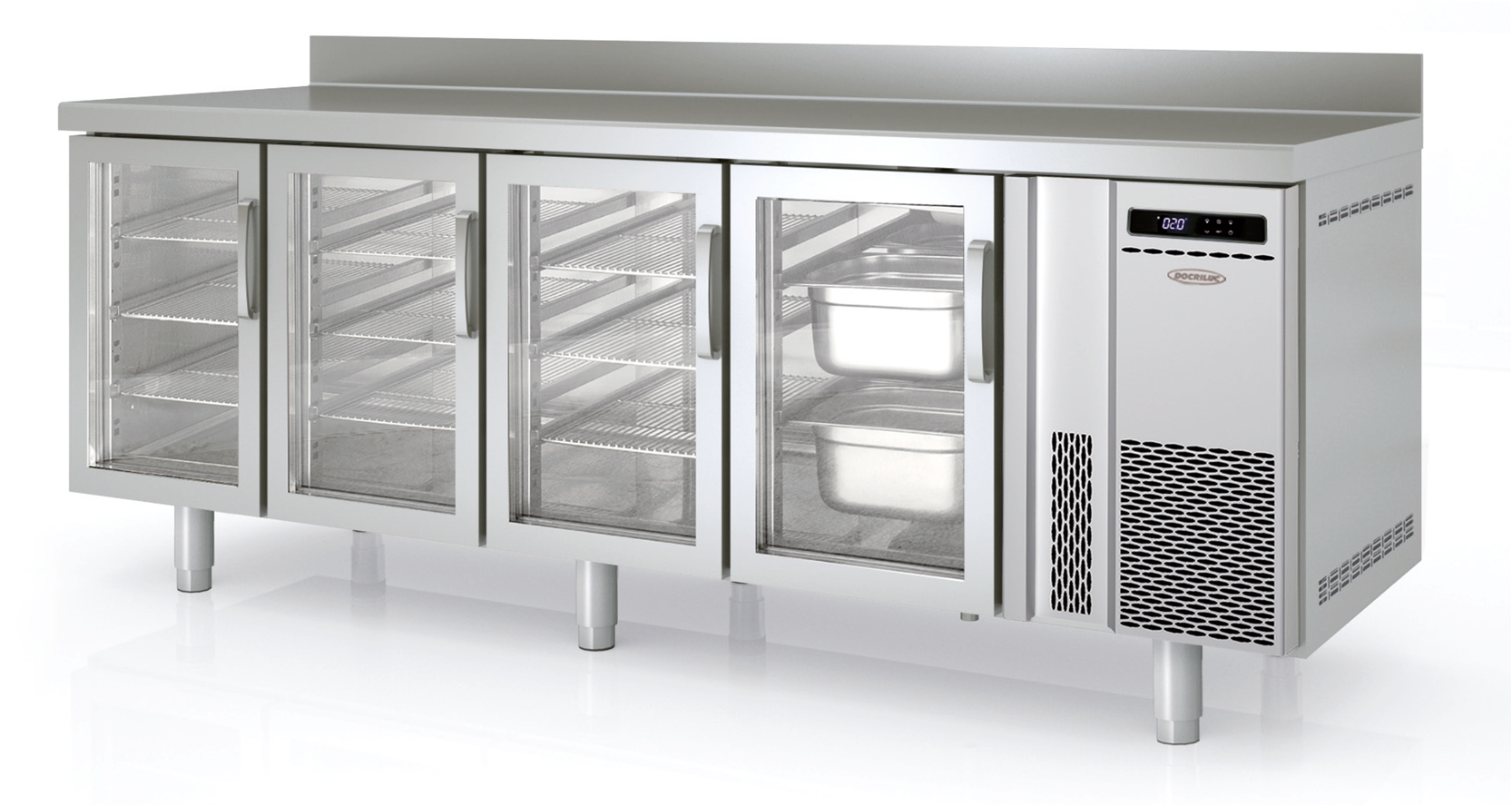 – Estantes interiores de varilla en acero plastificado, regulables en altura, sobre apoyos inox.