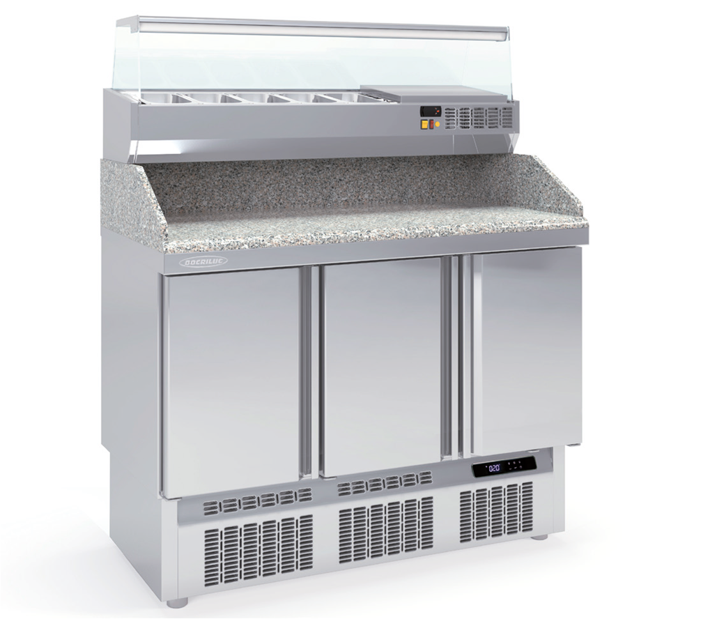 – DMF: Encimera de granito, con peto trasero y laterales de 180 mm. Expositor de ingredientes independiente, capacidad GN 1/4, incluido.