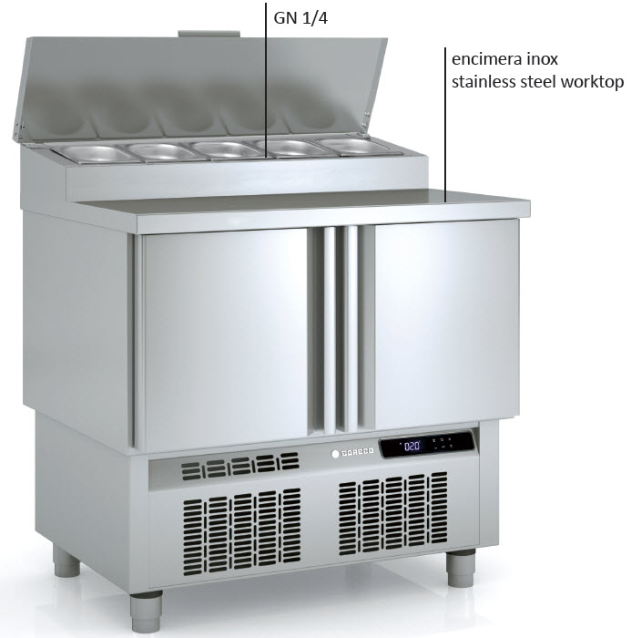 – Encimera inox. cubierta inox abatible sobre expositor ingredientes GN 1/4-150