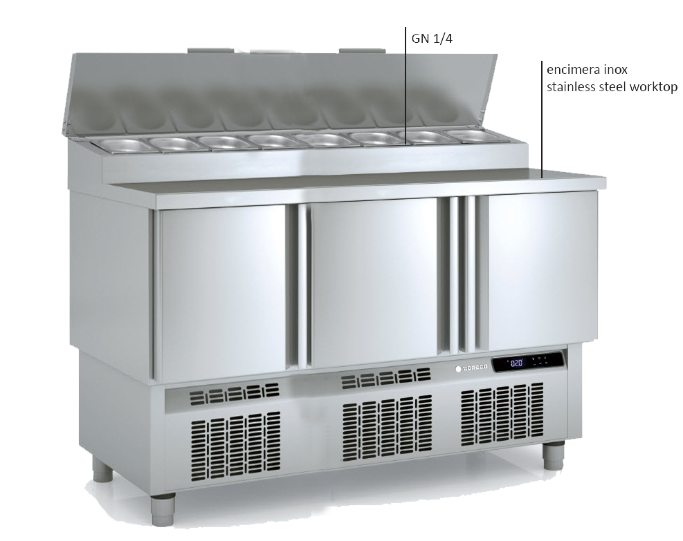 – Encimera inox. cubierta inox abatible sobre expositor ingredientes GN 1/4-150
