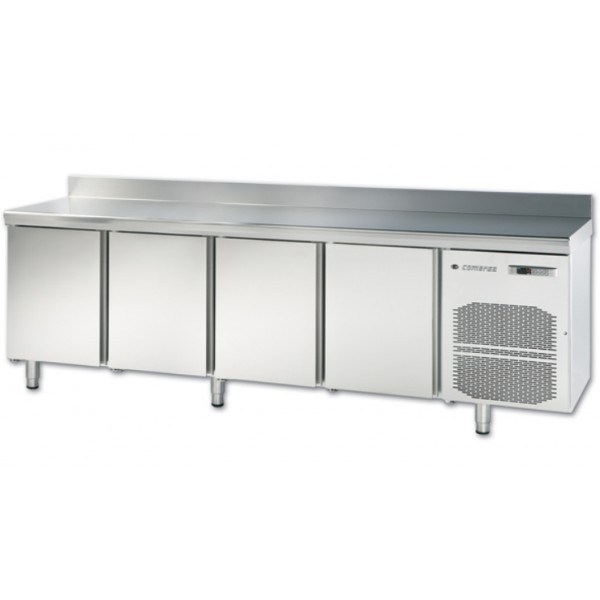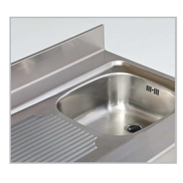 – Encimera de acero inox AISI-304 con frente curvo y peto trasero sanitario de 100 mm (opcional sin peto)