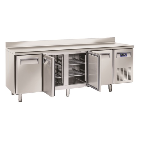 Mesas frías de acero inoxidable, con refrigeración ventilada, con peto. Aislamiento de 60mm. Puertas dotadas de autocierre. 2 estantes GN 1/1 por puerta en dotación. 4 pies regulables en altura. Control digital. Desescarche eléctrico. Guías en forma de «U». Clase climática 4.