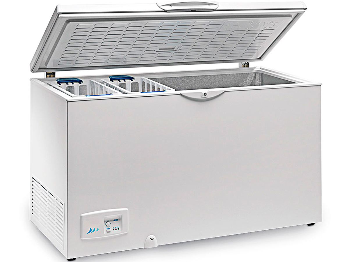 Congelador horizontal tapa ciega abatible HC 320 de EUROFRED. Tapa blanca.