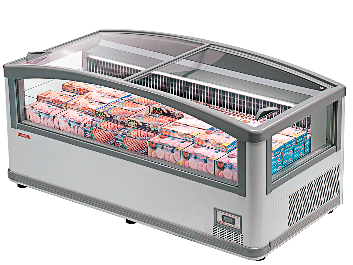 Tapas correderas de cristal curvado de baja emisión que garantizan una óptima visibilidad de los productos y reducen las dispersiones térmicas.