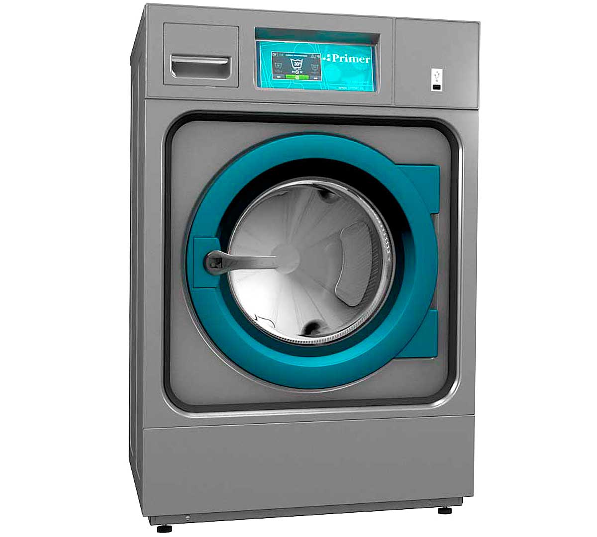 Lavadora profesional alta velocidad factor g 450 con válvula de desagüe LP-8 V T2 de PRIMER con mueble exterior de skinplate gris.