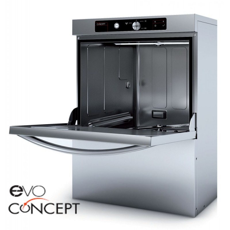 Lavavajillas de bajo mostrador y apertura frontal E-VO CONCEPT con cuerpo completo y puerta de doble pared (EFFI-SILENT), así como una puerta robusta y compensada con 3 posiciones; con tanque embutido de lavado, guías embutidas para cesto y brazos de lavado y aclarado en acero inoxidable AISI-304, Altura útil de vajilla hasta 380mm (GN1/1 válido)