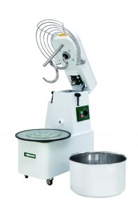 La particular forma de la espiral permite obtener masas perfectamente amasadas en pocos minutos. La cuba, la espiral, la columna central y la rejilla de protección son en acero inoxidable. El sistema de transmisión es especialmente silencioso, al estar realizado con un motorreductor en baño de aceite. El cabezal es abatible y la cuba extráible para facilitar la manipulación de la masa. Ideal para pizzerías, pastelerías y panaderías. Juego de ruedas (de serie)