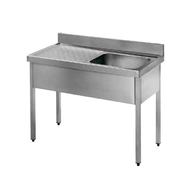 Fregadero industrial con 1 cuba + escurridor . Construidos totalmente en acero inoxidable. Dotado de válvula desagüe y tubo rebosadero. Peto posterior y frontal de 30 mm. Patas cuadradas de 40 x 40 mm con altura modificable hasta 900 mm. No lleva agujero para el grifo.