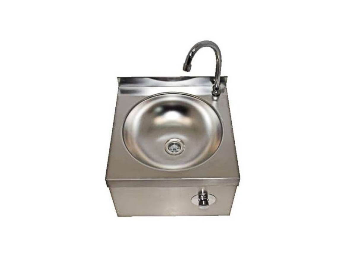 Lavamanos de rodilla fabricado en acero inoxidable aisi 304. Dotado de pulsador mezclador de agua y caño giratorio.