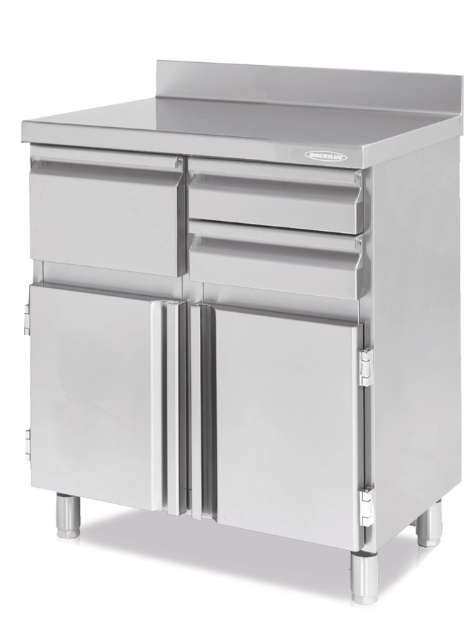 – Encimera de acero inox AISI-304 18/10 con frente curvo y peto trasero sanitario de 100 mm (Opcional sin peto).
