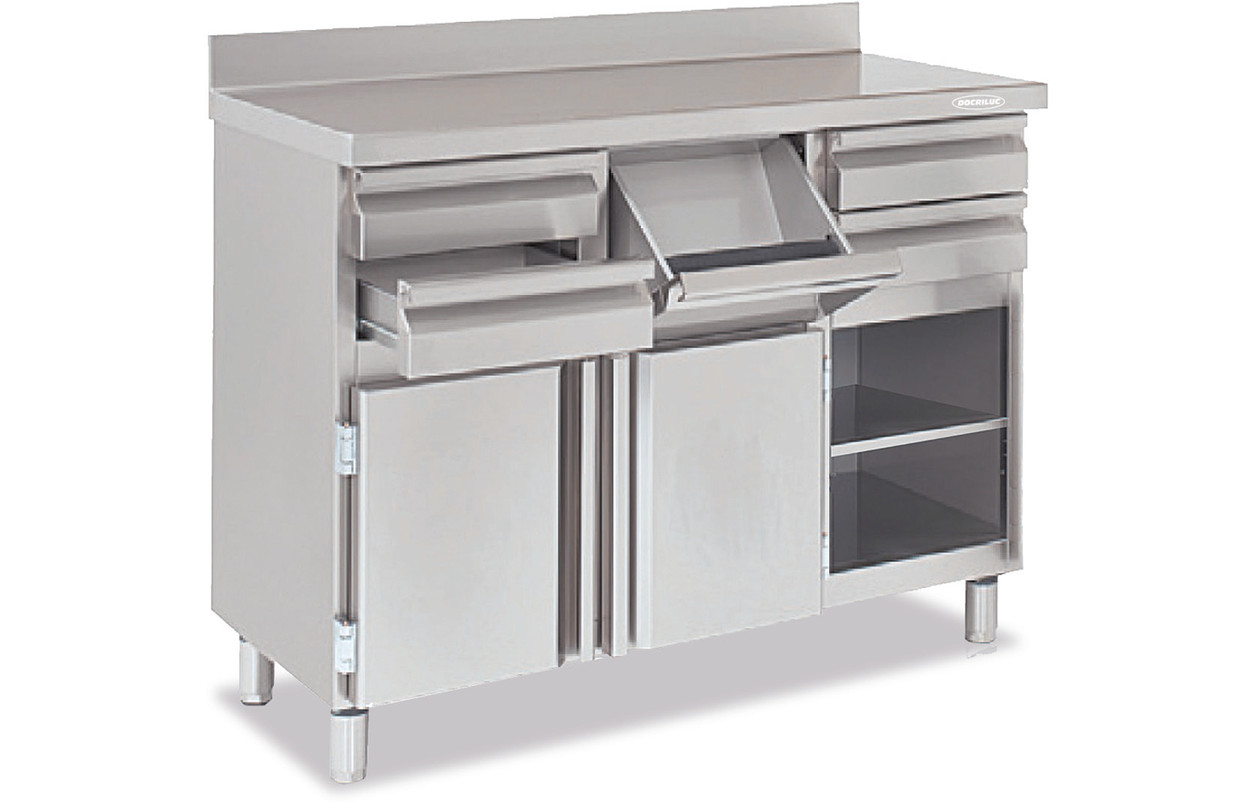 – Encimera de acero inox AISI-304 18/10 con frente curvo y peto trasero sanitario de 100 mm (Opcional sin peto).