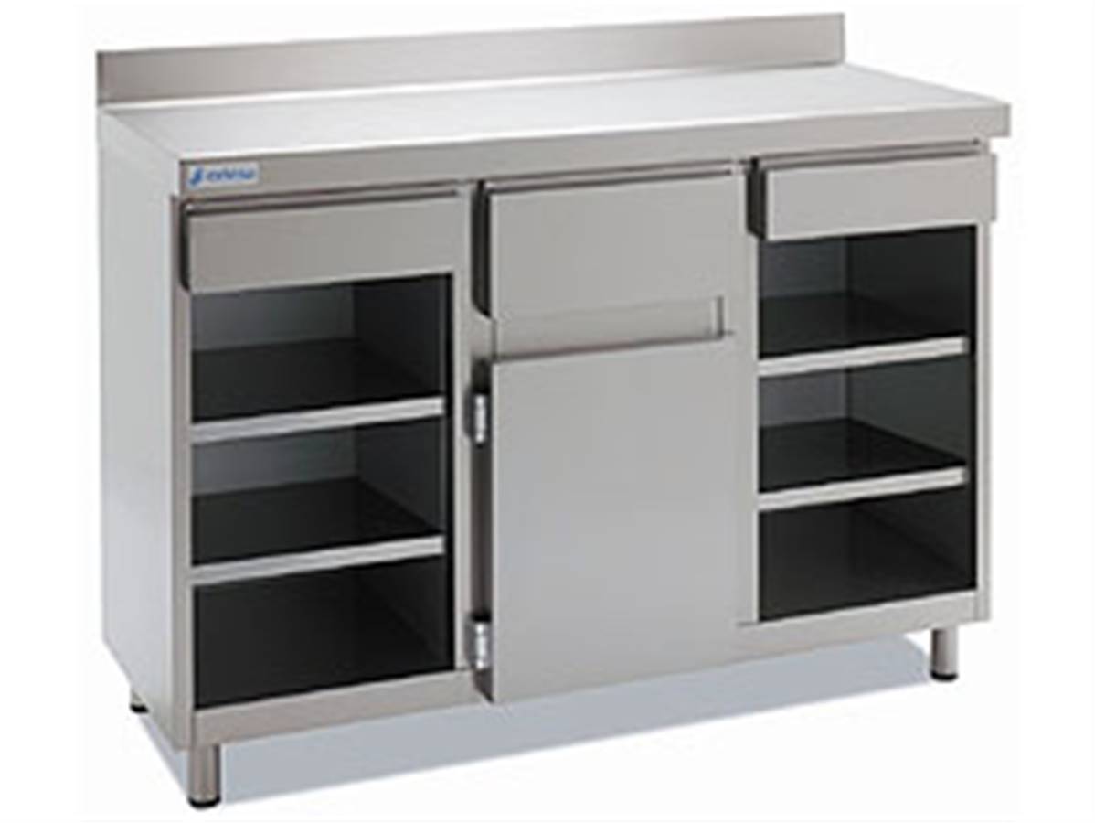 Frente mostrador mesa cafetera 2 estantes MAC-2E-O de EDENOX, en acero inoxidable, acabado satinado y trasera en acero plastificado prelacado gris.