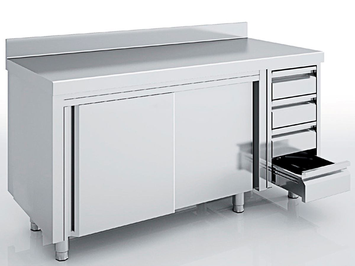 Mueble neutro con puertas correderas, encimera mural y cajones gama 700 MNCC70-M de ERATOS, fabricado en acero inoxidable AISI-304 18/10 con acabado satinado.
