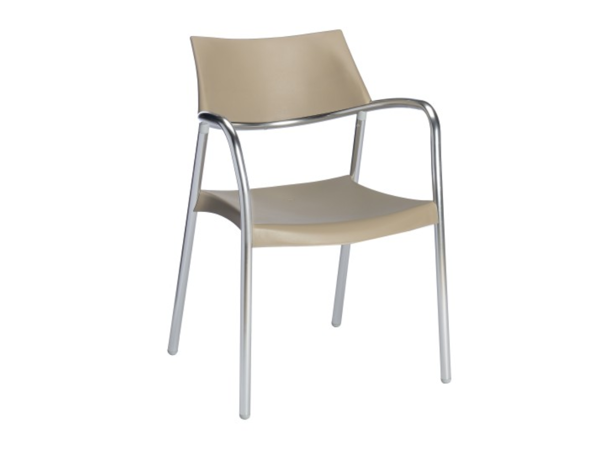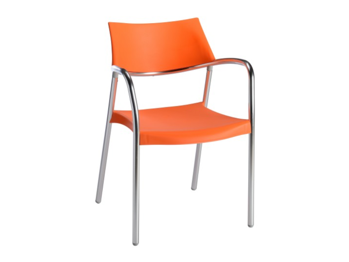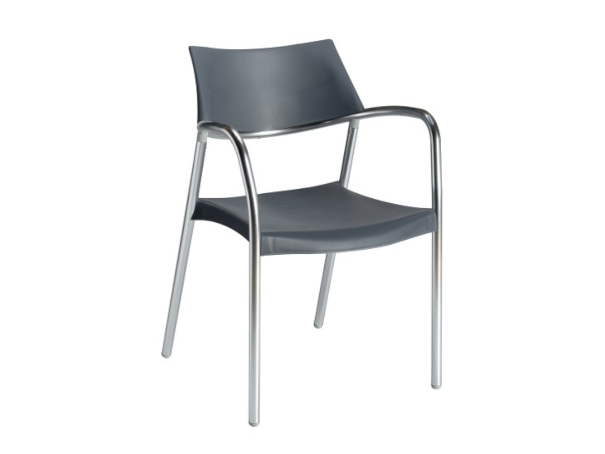 Silla con brazos para uso interior y exterior. Asiento inyectado en polipropileno, con patas y brazos de tubo de aluminio anodizado.