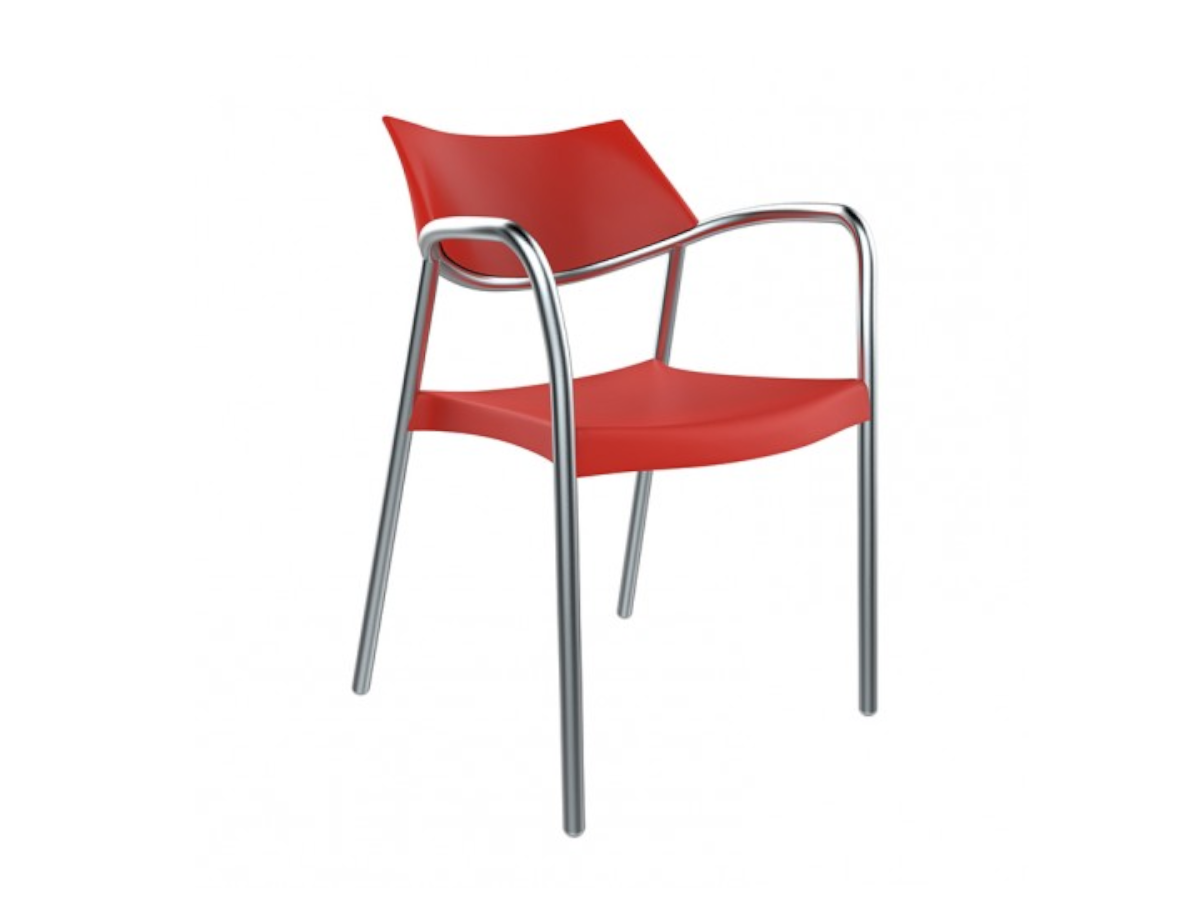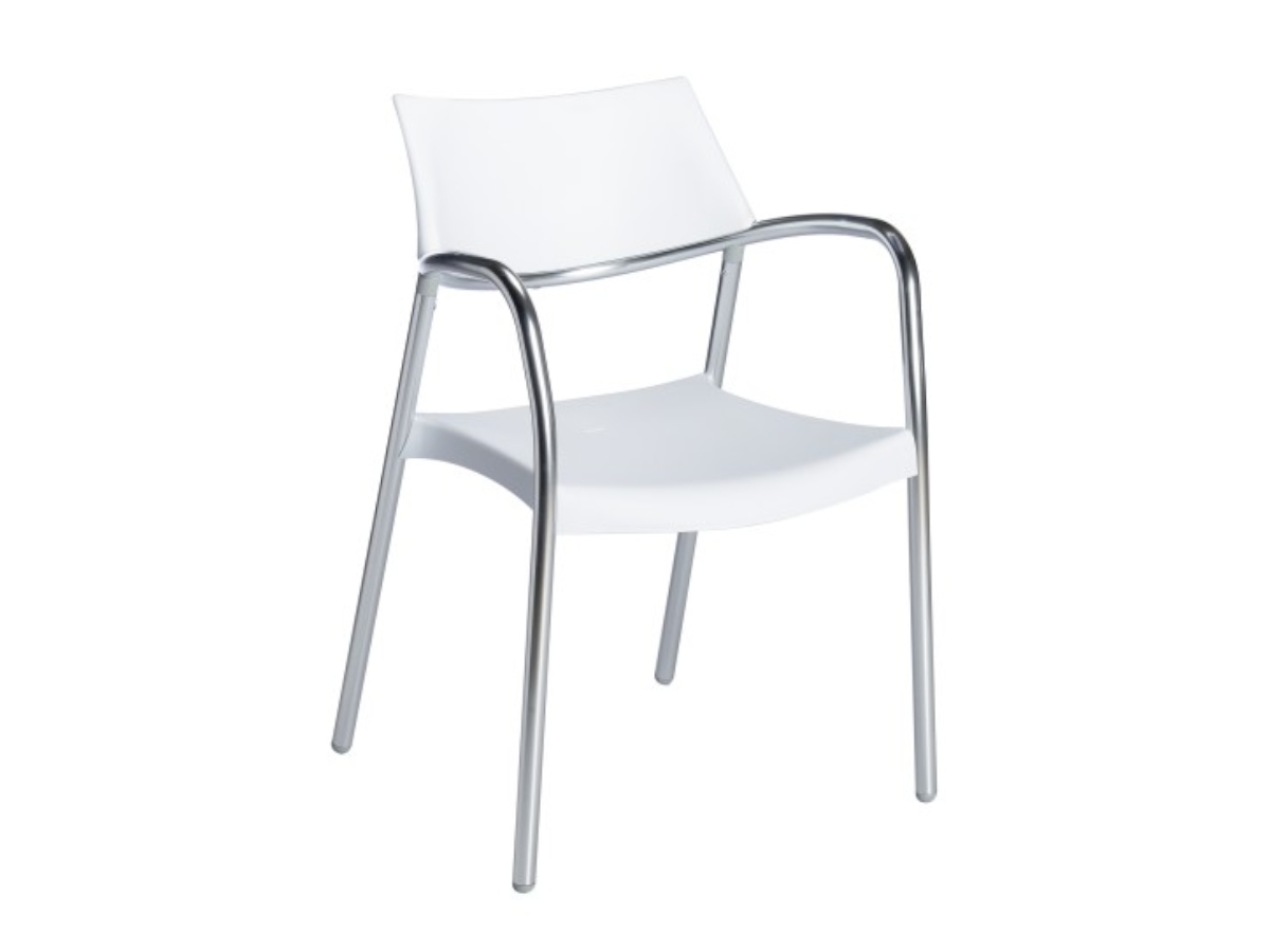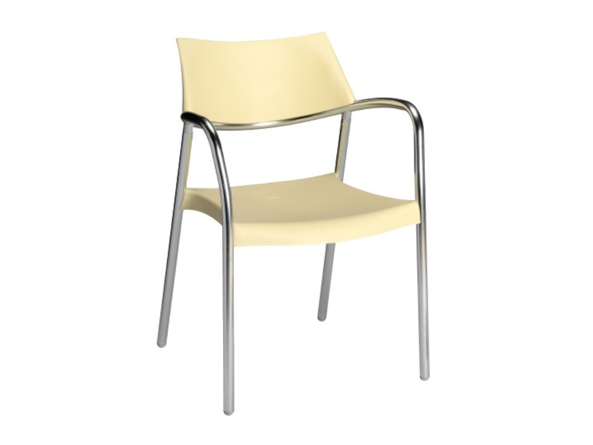 Silla con brazos para uso interior y exterior. Asiento inyectado en polipropileno, con patas y brazos de tubo de aluminio anodizado.