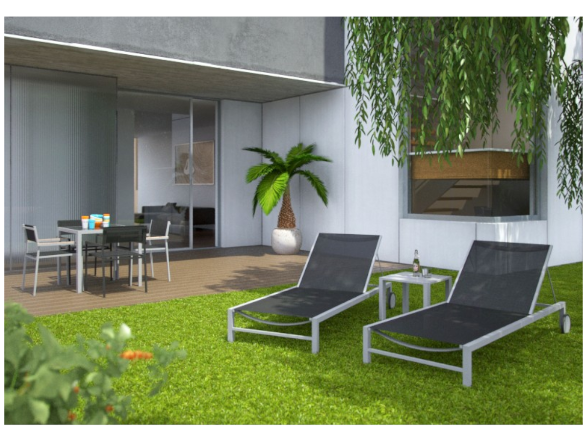 Tumbona CUBIC CONTRACT de RESOL, de aluminio pintado por pulverización en color gris claro y textilene de color negro.