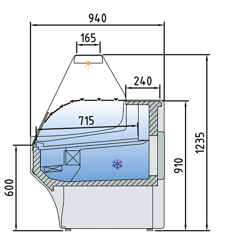 Vitrina Expositora Refrigerada Autoservicio VEE-9-20-TF de ColdQueen con Iluminación estándar LED: encimera superior y estante.