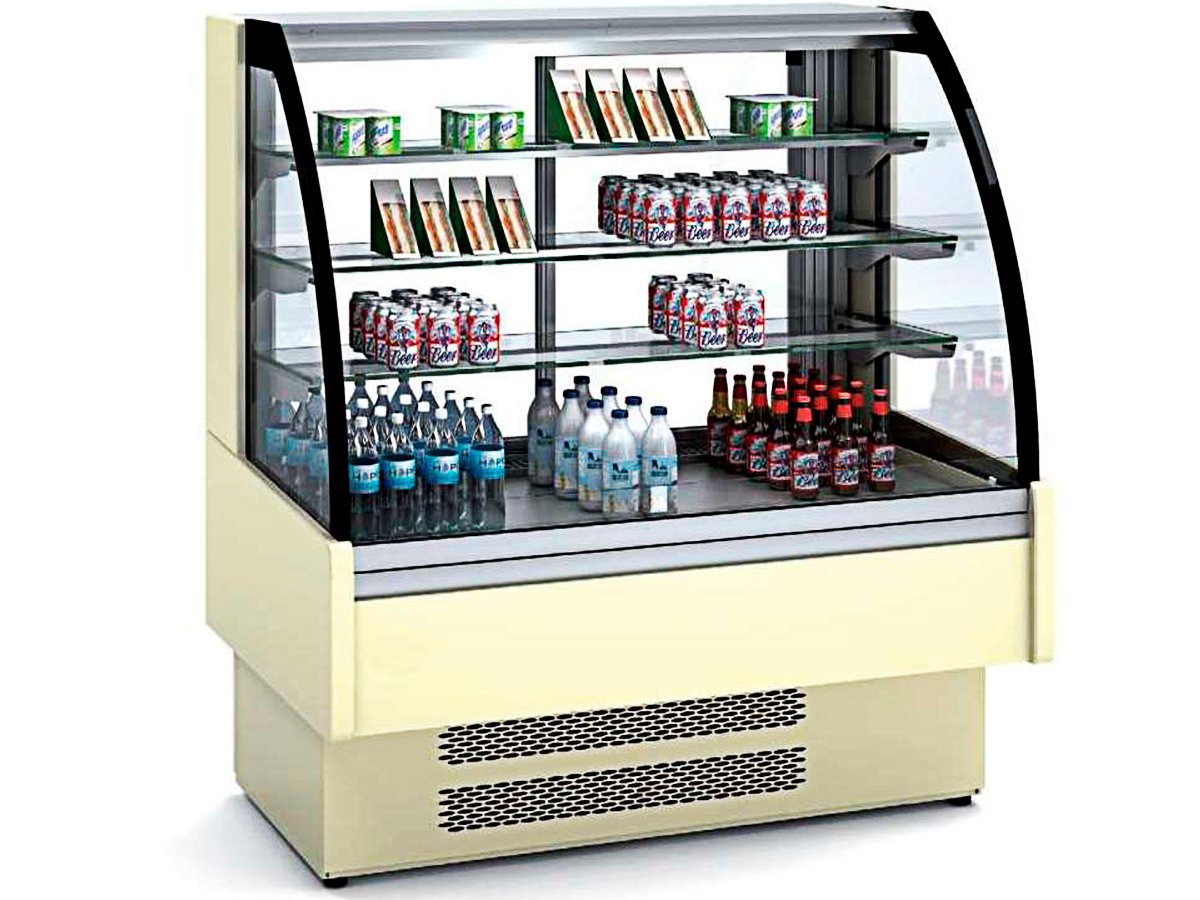 Vitrina refrigerada expositora autoservio cristal curvo con frío ventilado VVA-6-6-C de CLIMA HOSTELERÍA, exterior en chapa de acero plastificada, lacada o inoxidable.
