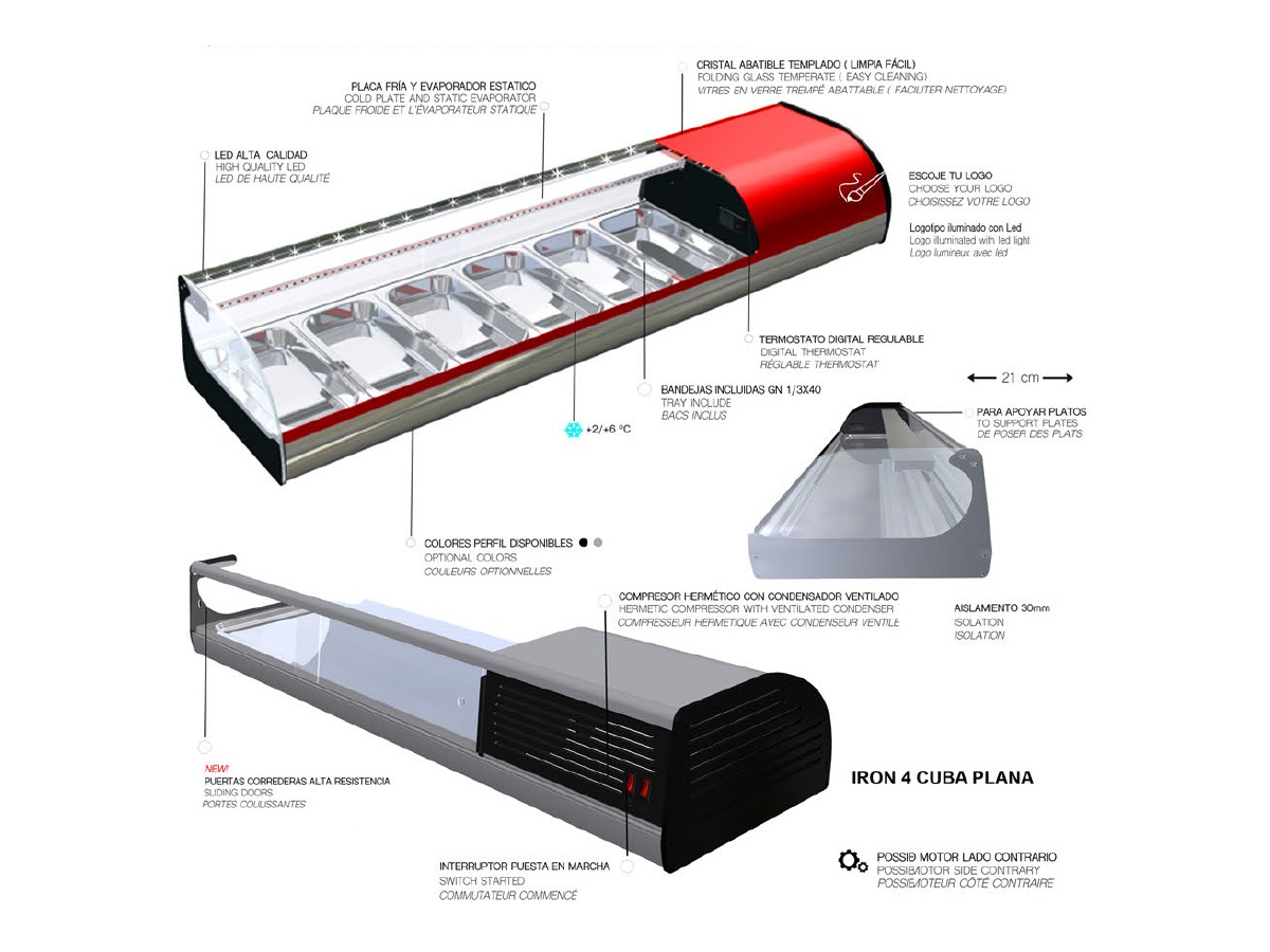 Vitrina Refrigerada IRON 4 SUSHI de I90 con placa fría y evaporador estático. Termostato digital regulable.