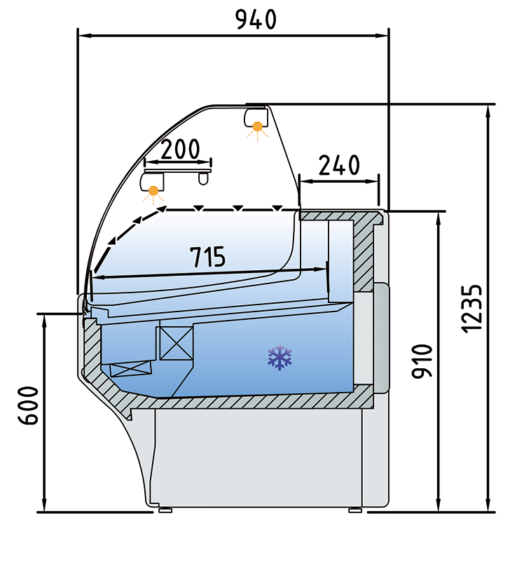 Vitrina Expositora Refrigerada VE-9-13-CC-TF de ColdQueen con Iluminación estándar LED: encimera superior y estante.