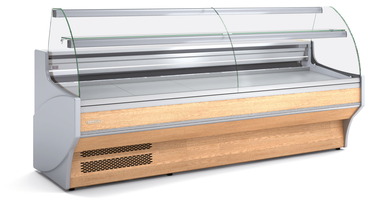 Vitrina Expositora Refrigerada VE-9-30-CC de ColdQueen con Para-golpes en la parte delantera.
