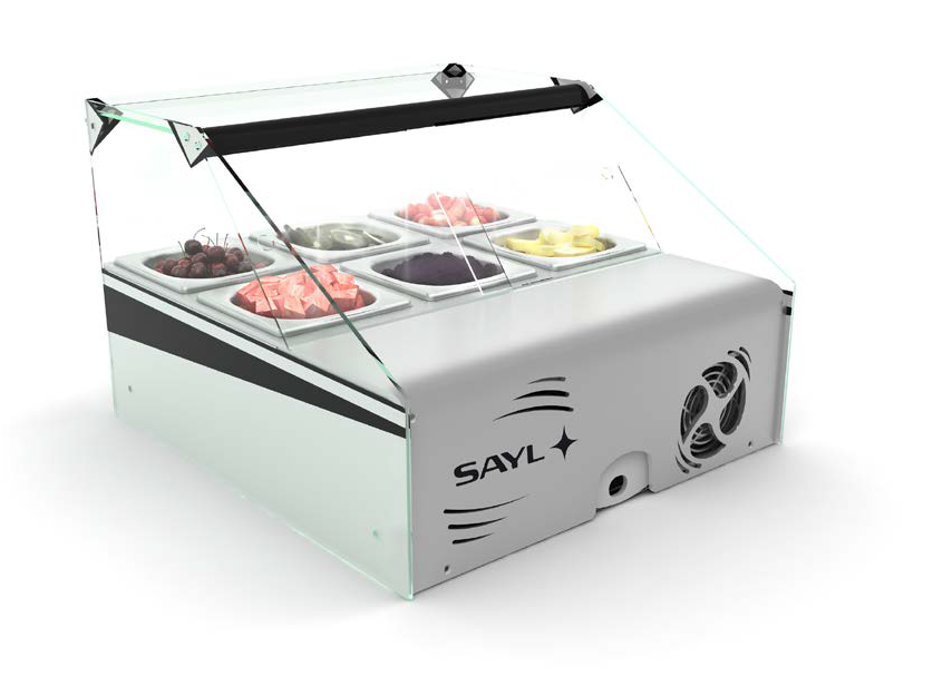 Práctico diseño de expositor refrigerado, muy versátil, para alojar los ingredientes topping (frutas, chocolates…) de yogures y helados.