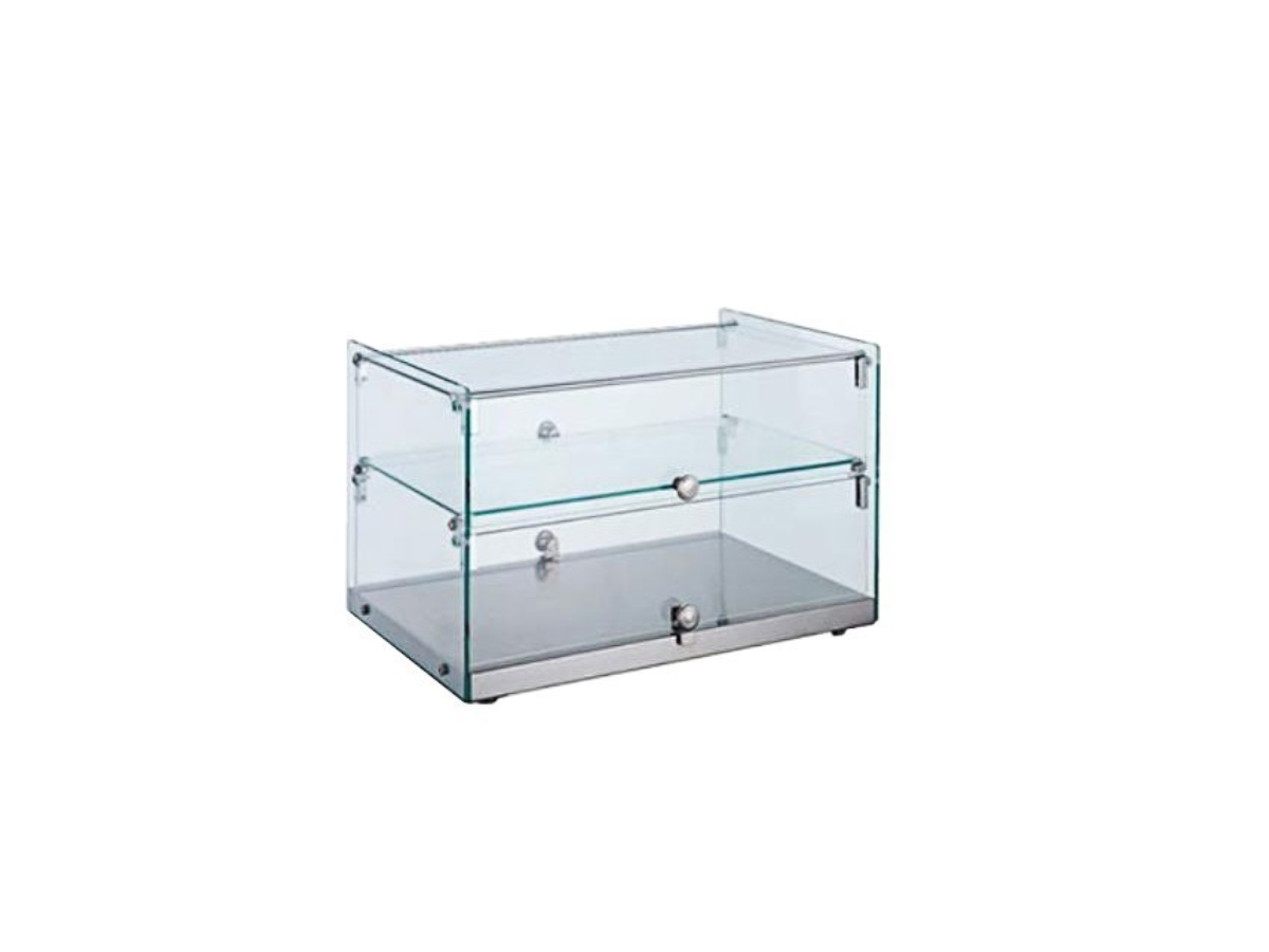 Vitrina Neutra Expositora VRC-50L de EUTRON con cristal recto y base de acero inoxidable.